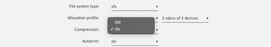 • ZFS-Laufwerk vs. vollständiger zpool: Ein einzelnes ZFS-formatiertes Laufwerk im Unraid array bietet nicht die Redundanz oder den Funktionsumfang eines dedizierten ZFS-Pools. Um erweiterte Funktionen zu nutzen, verwenden Sie dedizierte Pools.
