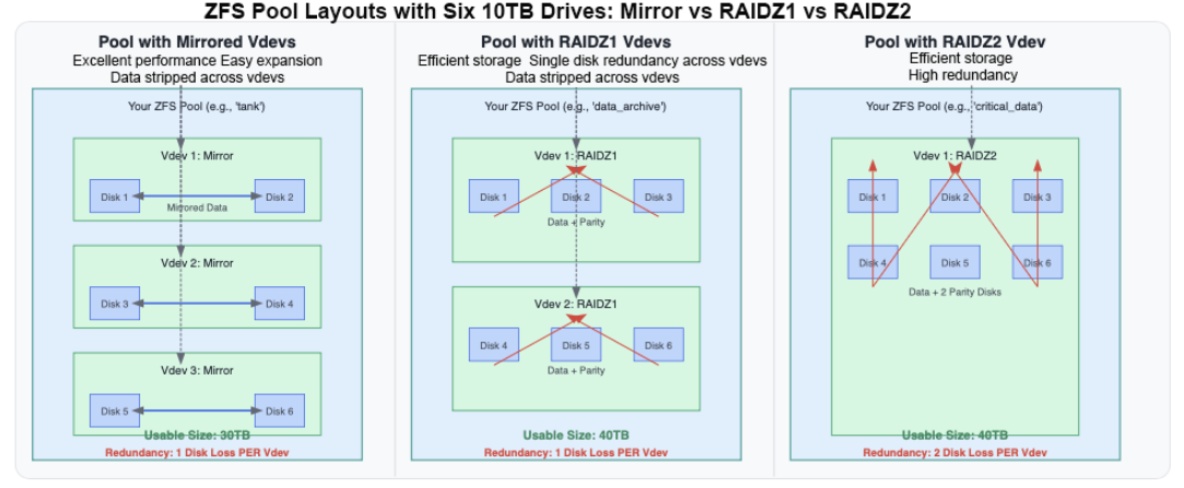 Redundanz gilt immer pro vdev. Wenn ein vdev ausfällt, fällt der gesamte Pool aus, auch wenn andere vdevs gesund sind. Planen Sie Ihre vdevs sorgfältig!