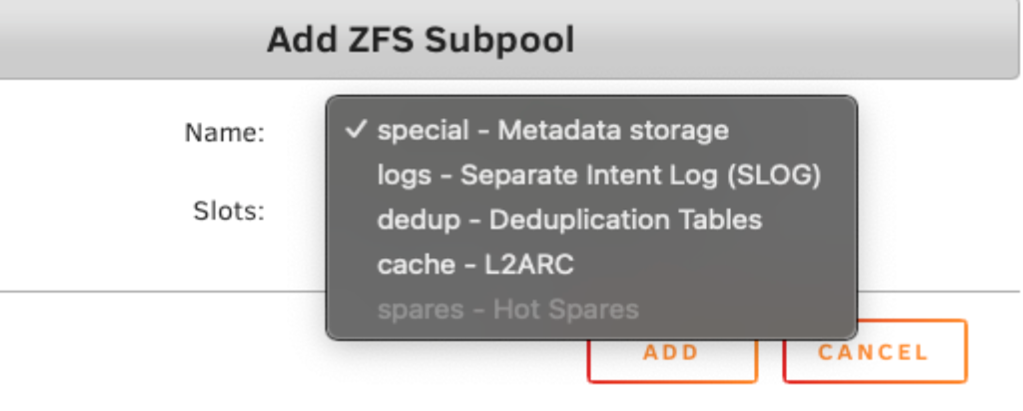 Unraid se refiere a los vdevs de soporte ZFS como subpools. La mayoría de los usuarios no los necesitan, pero los usuarios avanzados pueden encontrarlos: